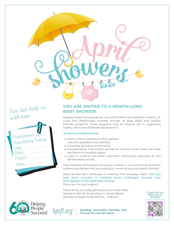 “April Showers” collection boxes are placed in businesses throughout Martin, St. Lucie and Okeechobee counties to be filled with such infant-related things as developmental toys, baby clothing, rattles, books, diapers and wipes.