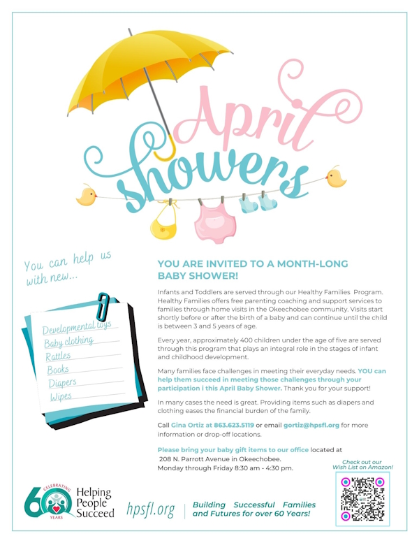 For many years, Helping People Succeed has coordinated month-long “Baby Showers” during the month of April, seeking baby necessities for families in need.